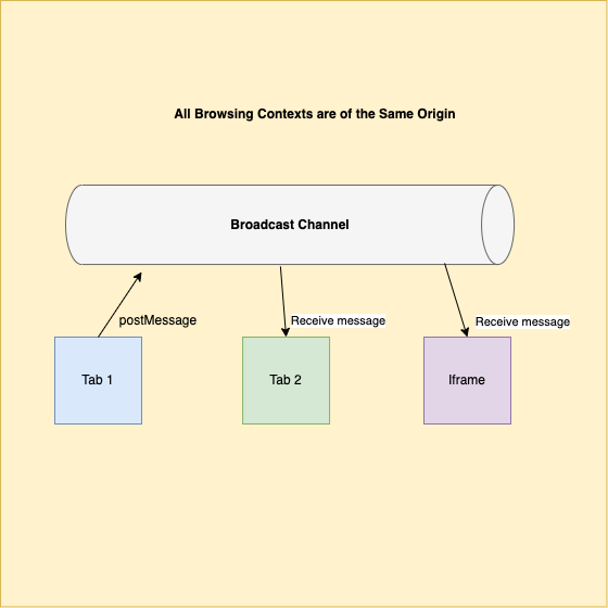 Broadcast Channels support communication between browsing contexts (such as tabs, windows, or iframes) on the same origin (domain, protocol, and port). It's akin to a magical string attached between different parts of your application, enabling them to send messages to one another. see (Broadcast Channel API on MDN)